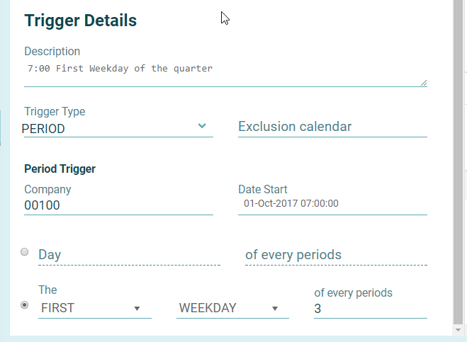 A period trigger allows you to schedule jobs based on the financial pattern that is defined for your company within the JDE system.