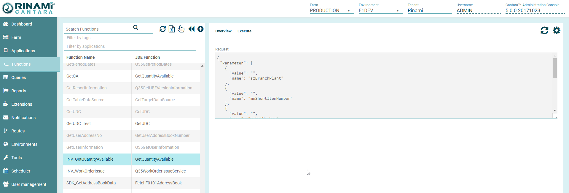 You can retrieve example request definitions in either JSON format from the Cantara Administration Console. Open the service definition and click the Execute tab to see the request information.