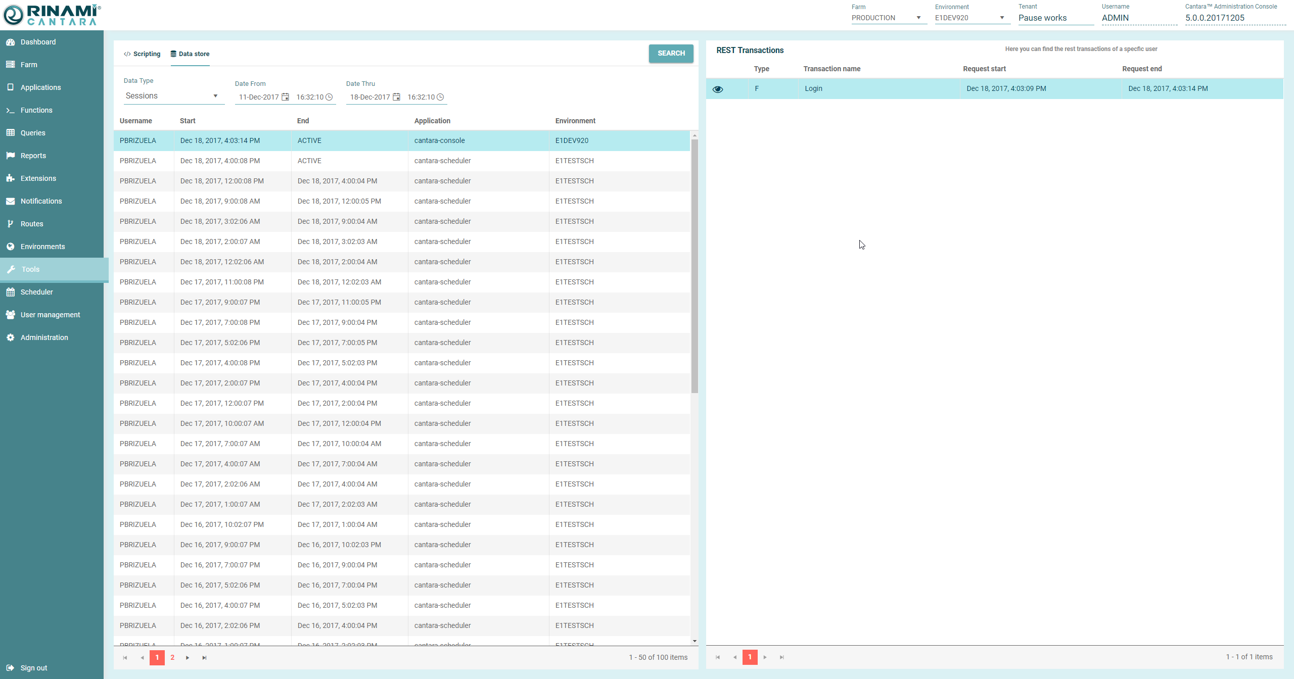 Click Data store option, by default you will be able to see latest week sessions. If you select one of them, you will be able to see all REST transactions that were executed by that session.