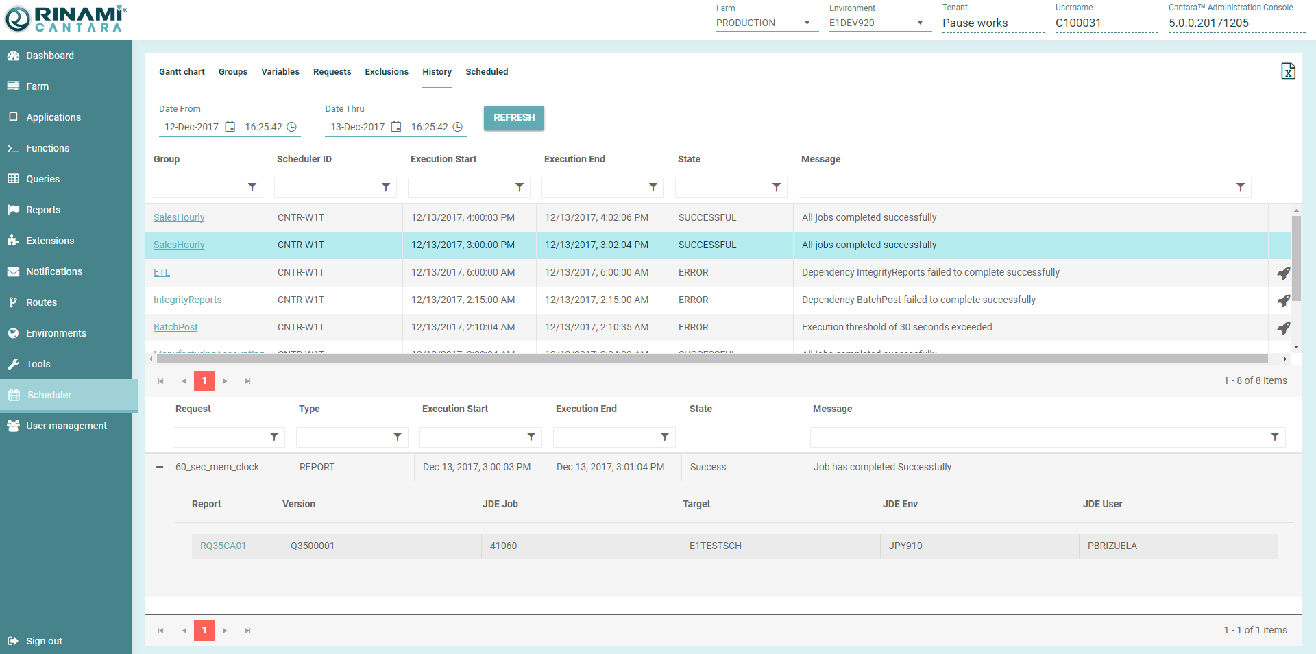 Select a Group in the list. The request(s) allocated to the group and their details are displayed at the bottom of the page. For requests that are a UBE you can review the JDE job details including the Cantara Environment that the job was submitted to and the JDE Job ID.