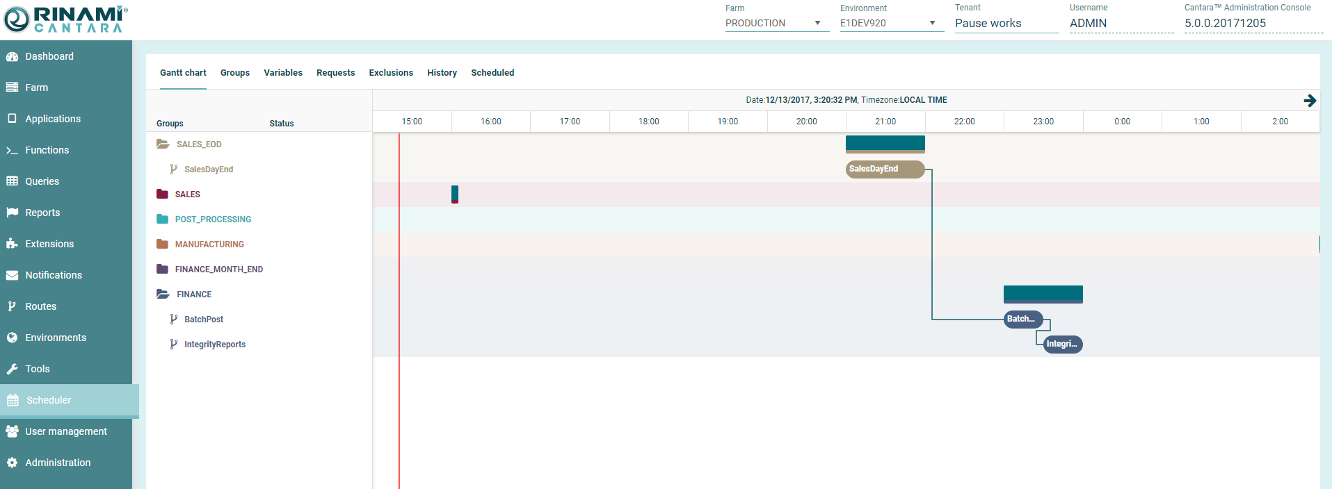 A Gantt chart is a visual that is used to illustrate scheduled. The Gantt chart feature in the Cantara Integration Platform allows you to obtain a visual of scheduled groups.
