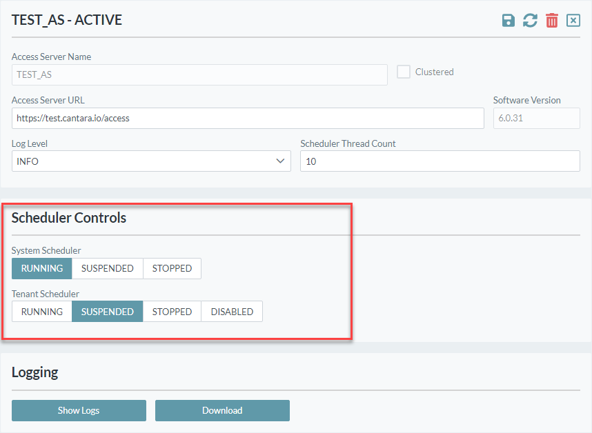 - Click the Save button. If the Access Server is online, the Scheduler Controls for the Access Server will be displayed. Refer to Scheduler Controls below for further information.