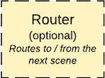 | The Router is responsible for separation of navigation logic from the View. The Router creates new Scenes and injects the relevant data into the new Scenes through the Interactor's data store. |