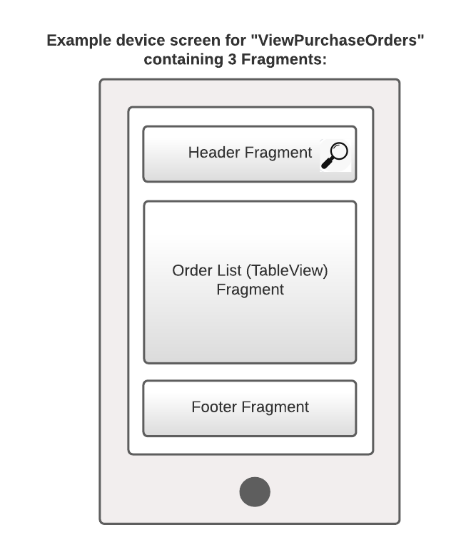 The fragment layout example pictured below is for the View Purchase Orders screen. The class diagrams which follow show how the Fragments are managed. Note that the classes used to implement the components of the Scene model are slightly different on iOS and Android.