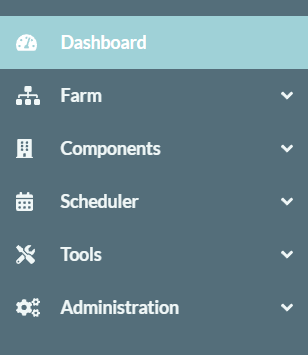 At the top of the Dashboard is a status bar, which remains available on all console screens. It contains the main menu button on the left, which opens the navigation panel. The status bar also displays the current farm, license, environment and user.