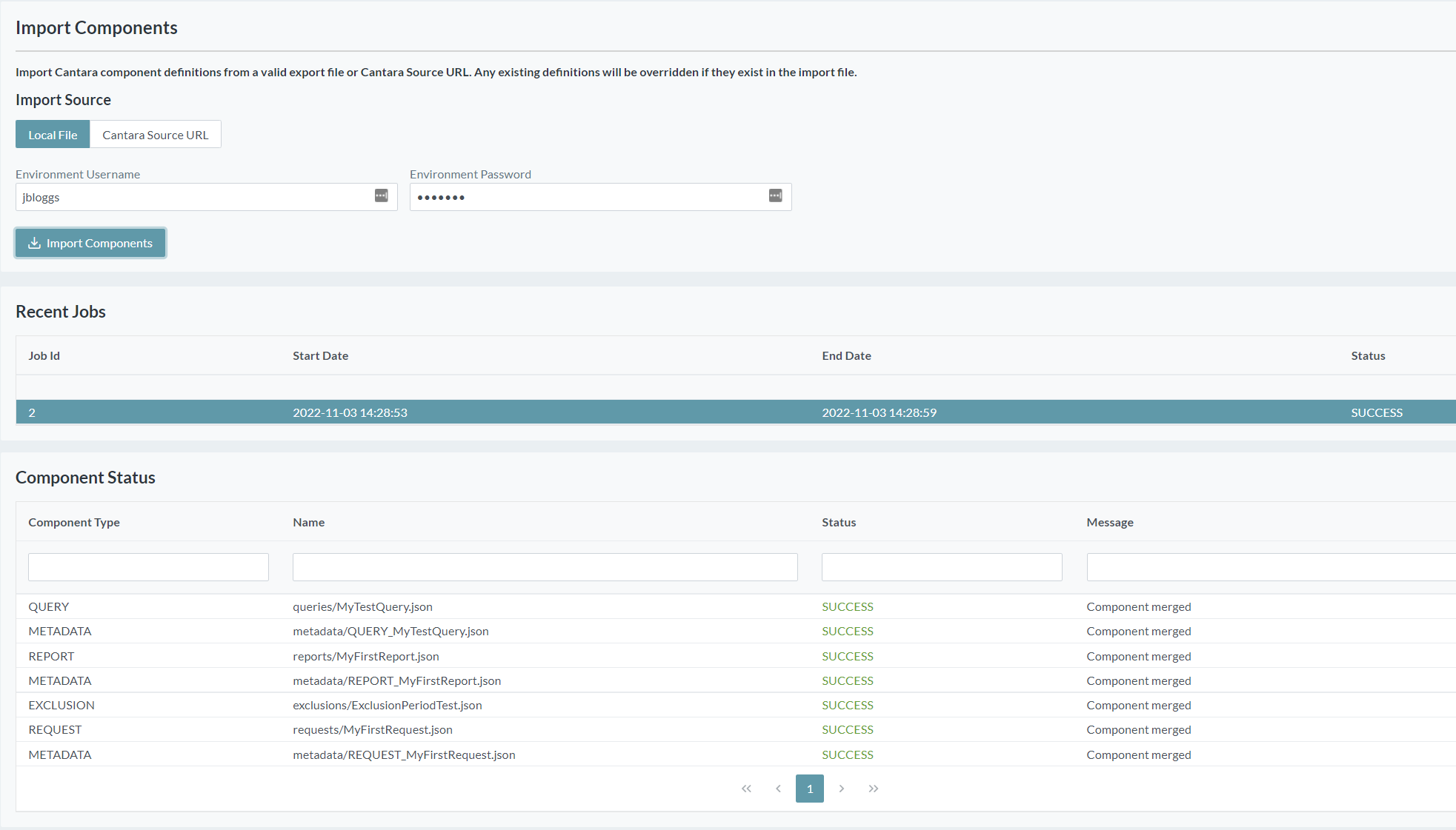 - Enter the Cantara API Version, Tenant ID, Token Username/Password and Cantara Source URL for the server where the components are to be imported from
