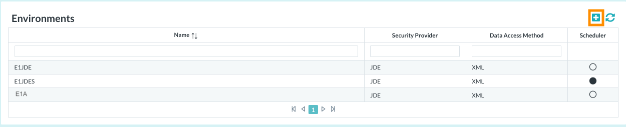 - Select the Environments node. A list of the configured environments is displayed: