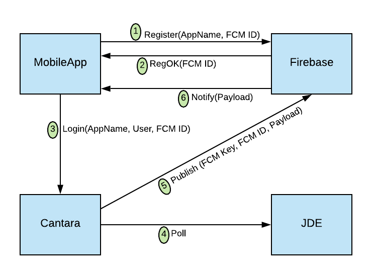 | 5 | Publish | Cantara publishes a payload to Firebase. |