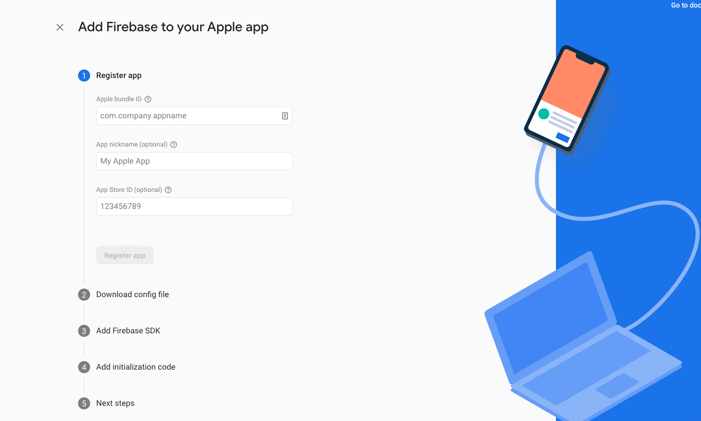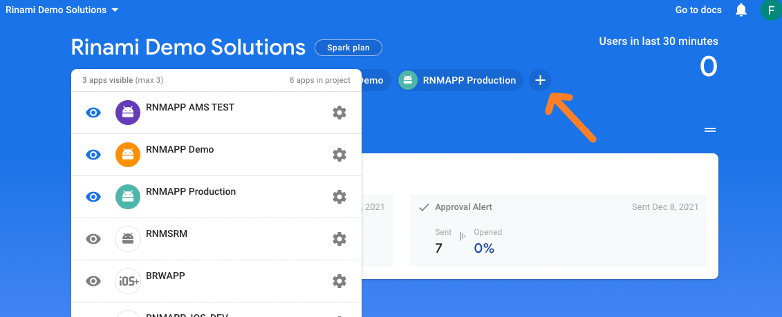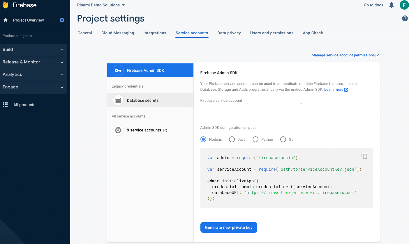 Each Firebase 'app' in the project includes an SDK, which should be downloaded. The SDK contains code that must be integrated with the Rinami app source code.