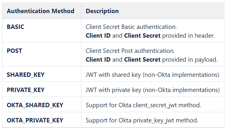 The following table defines Cantara support for the different client authentication methods. Implementation details such as required parameters may be vendor-specific. Refer to vendor documentation from your authentication provider for information about your chosen authentication method.