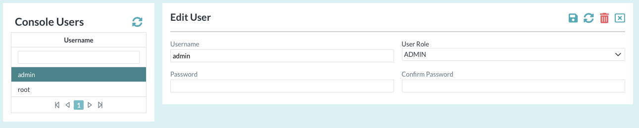 The Console Users screen is used to manage the user accounts that have access to the console.