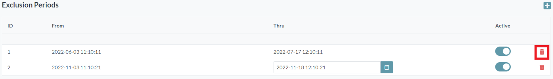 - Select the Active option so that the exclusion periods are applied. You can deactivate an exclusion set if required.