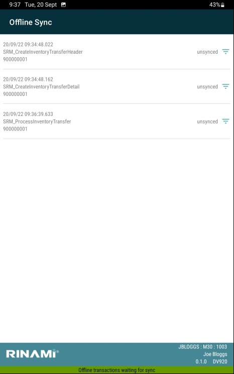 Cantara Mobile Apps do not transition back to online mode automatically. When the operator returns to an area with network coverage, they must initiate a data sync operation, to upload the locally stored transactions to JDE.