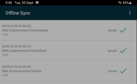 By selecting Sync from the app menu again, the sync operation will be resumed starting from the failed transaction.