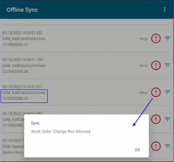 It is possible that before a sync operation can be performed, data stored in JDE may have changed. Perhaps another user has closed a work order before the app's sync operation can do so. Examples like this will cause a sync transaction error. When sync errors occur, additional error information is available in the app's sync log.