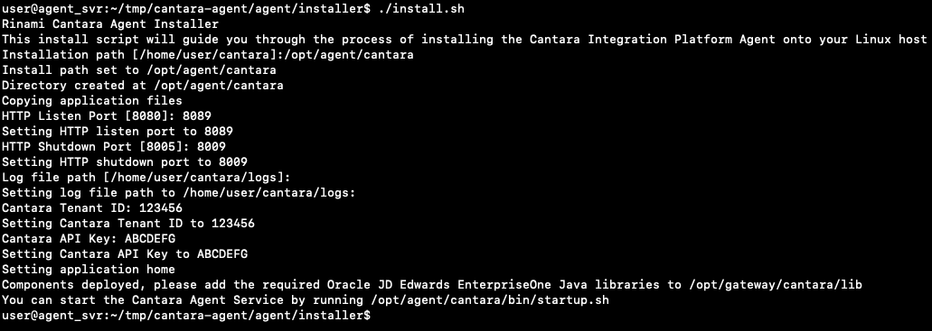 Navigate to the agent/installer subfolder and run the appropriate installation script for your platform.You will be prompted to enter details relating to your Cantara installation, including the required install destination folder, and also your Cantara Tenant ID and API Key.