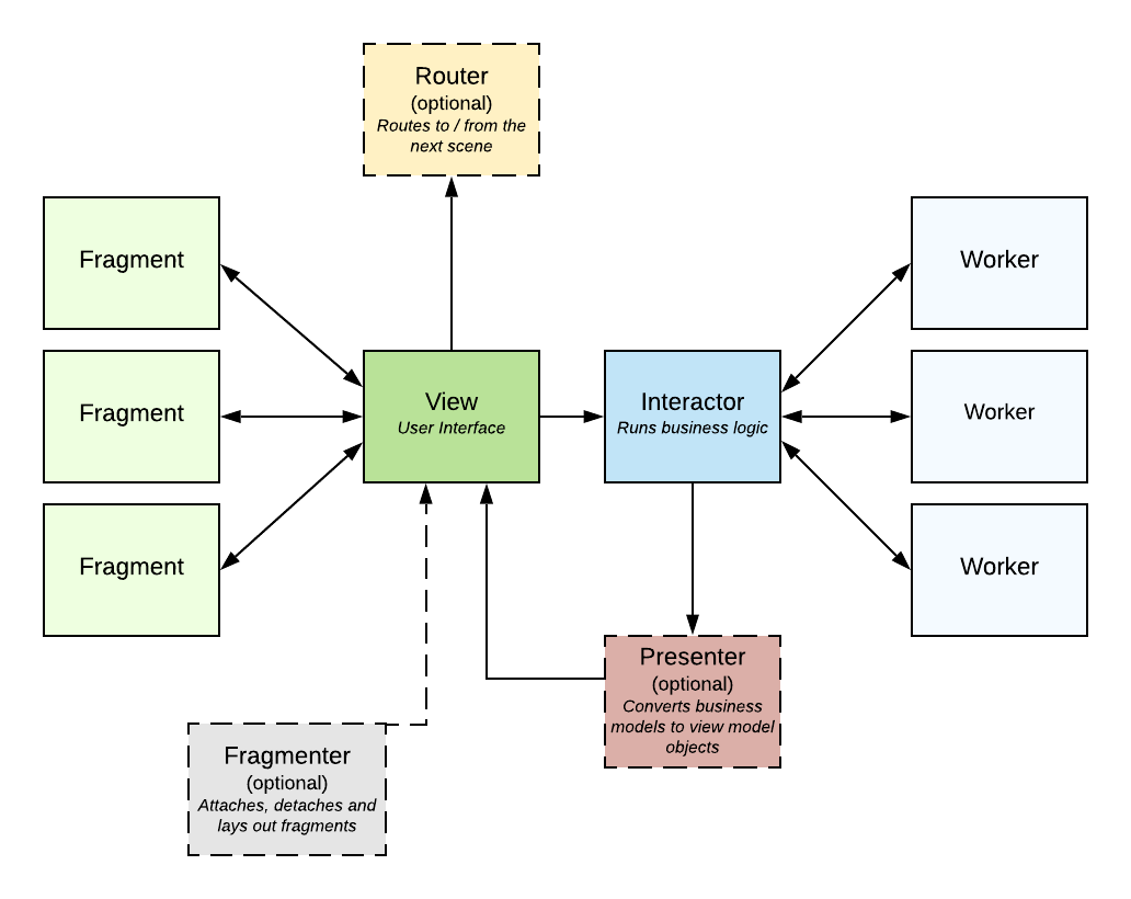 | The Interactor contains the business logic. This is where decisions are made about where / how to store data, and make changes to the application state. These actions are performed by Workers attached to the Interactor. An Interactor is generally attached to a Scene, but can persist beyond the Scene's lifecycle. For example, when an Android screen is being rotated by the user, the Scene gets destroyed and recreated. However, the Interactor has been designed to persist, in order to avoid losing operations or data during the screen rotation. |