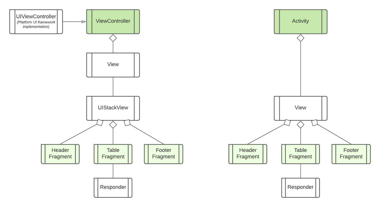 - On iOS, a ViewController interacts with a Fragmenter class to create, attach and manage fragments. A fragment must have a ViewModel.