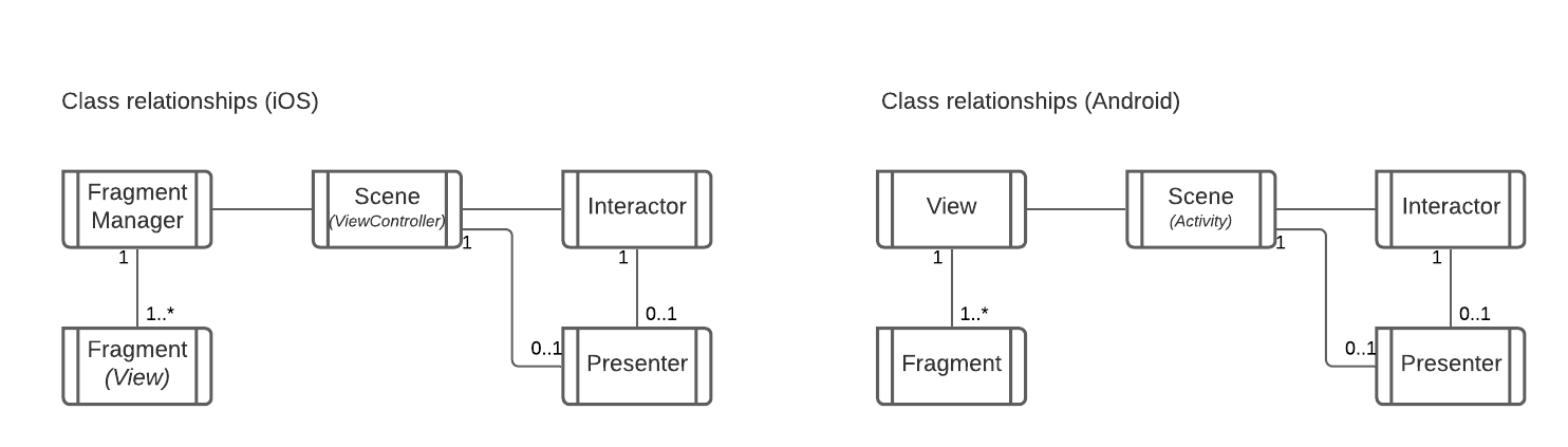 Each of the classes shown In the above sequence diagram is a protocol. How each protocol is implemented is up to the developer - e.g. on Android, the Fragment Manager and Presenter functionality are actually part of the Activity class, but on iOS they are implemented with separate classes.