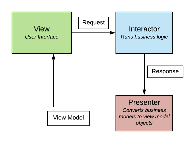 - The Interactor takes the result and puts it into a response object which is passed to the Presenter.