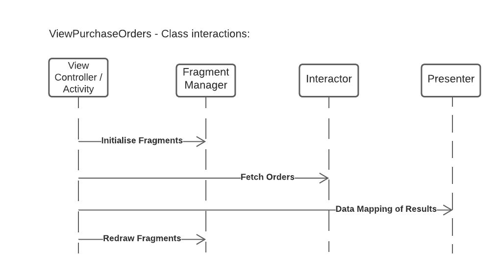 The fragment layout example pictured below is for the View Purchase Orders screen. The class diagrams which follow show how the Fragments are managed. Note that the classes used to implement the components of the Scene model are slightly different on iOS and Android.