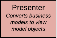 | The Presenter is responsible for translating business models into view model objects. In some cases this translation is minor and does not warrant a separate Presenter class, in which case the Presenter can be in the View. |