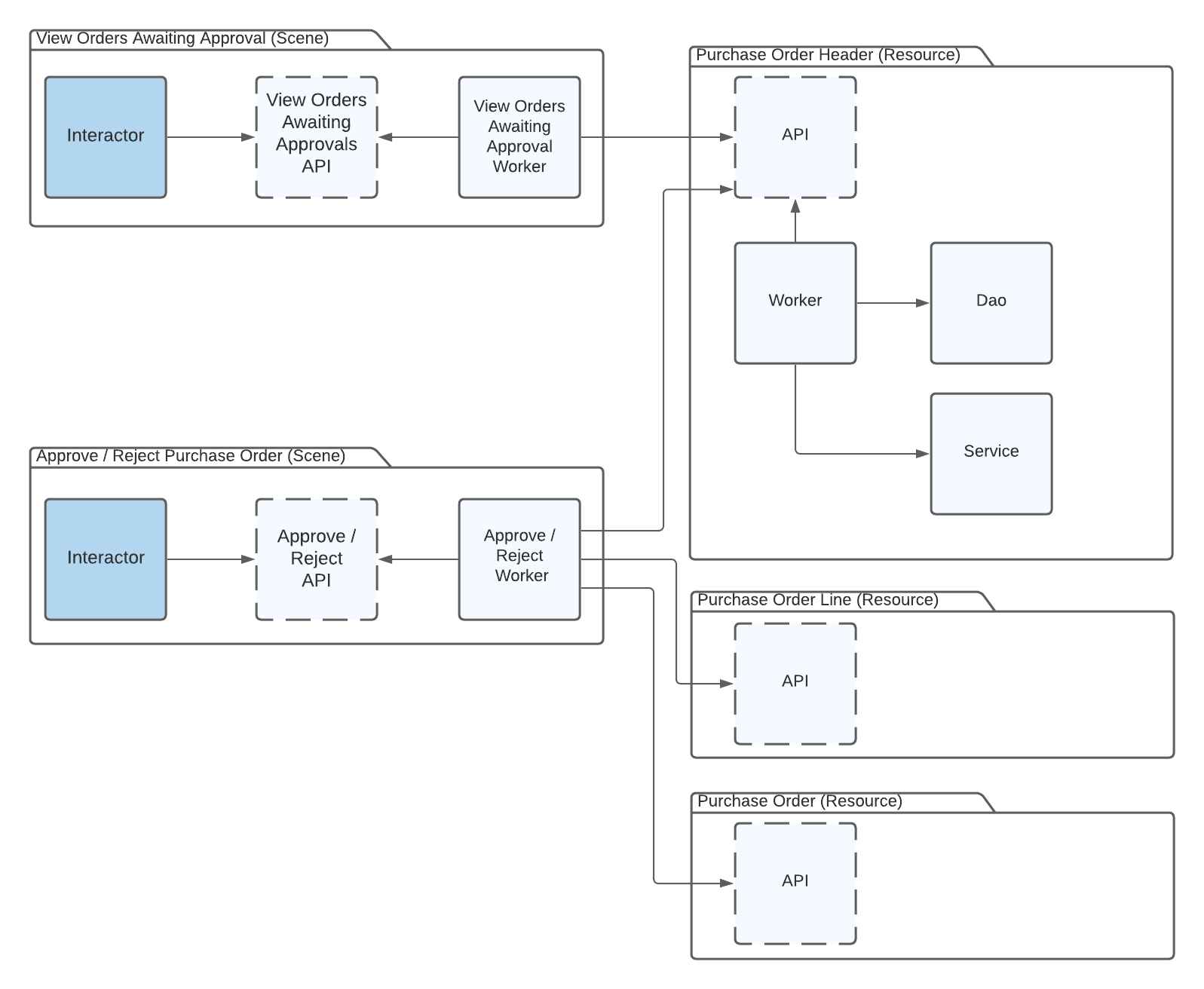 - The Interactor takes the request object and delegates the work to a Worker.