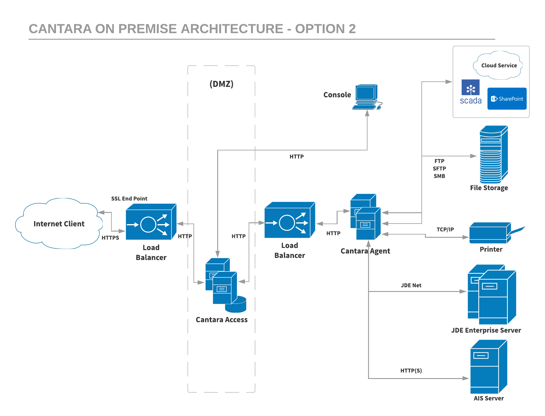 You can choose to deploy the Cantara Agent for an on-premise installation of the Cantara Integration Platform. This allows the access instances to be moved to the DMZ for added external intrusion protection.