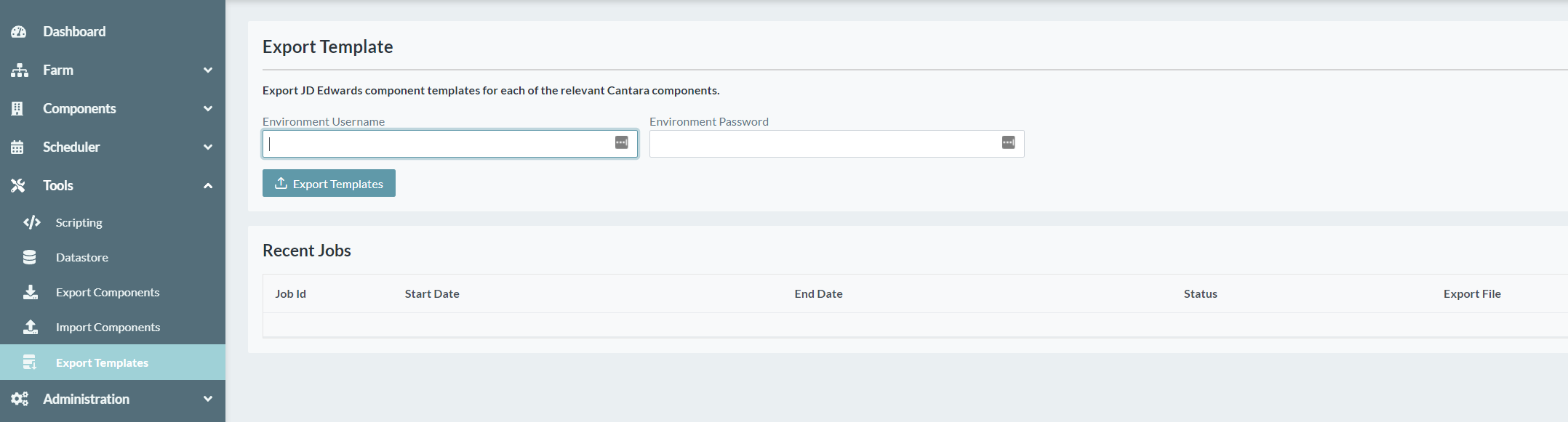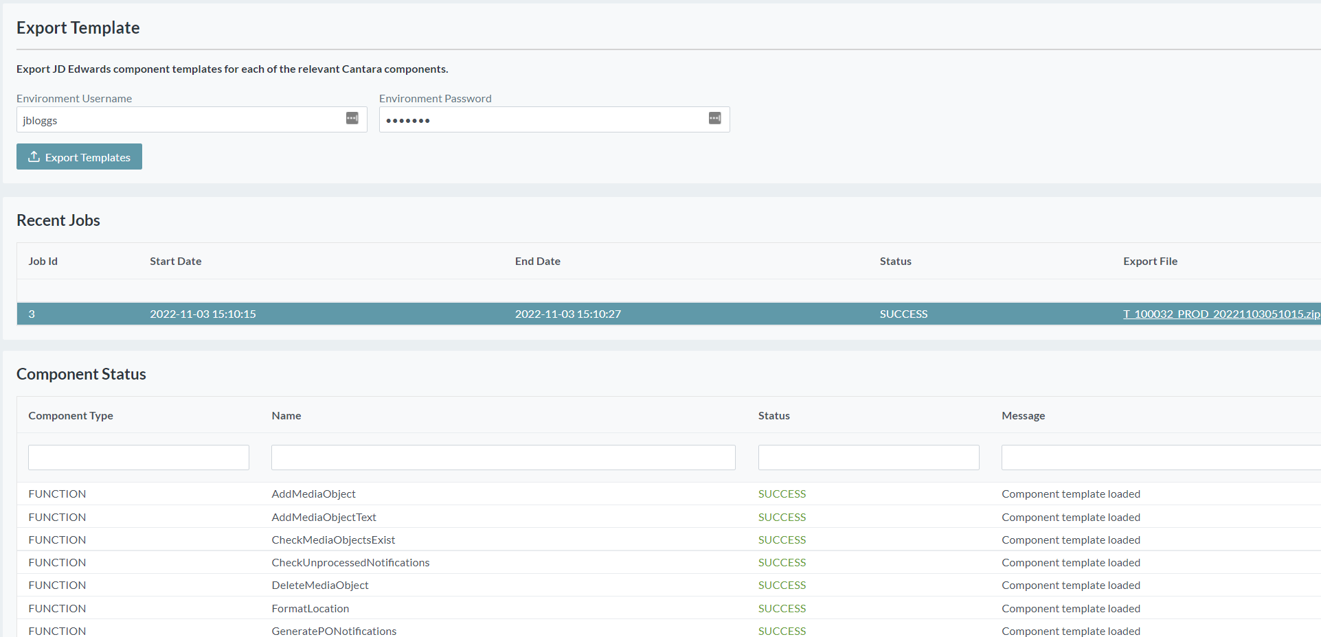 - Enter the current environment Username and Password and click the Export Templates button.
