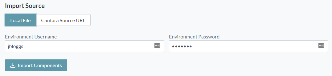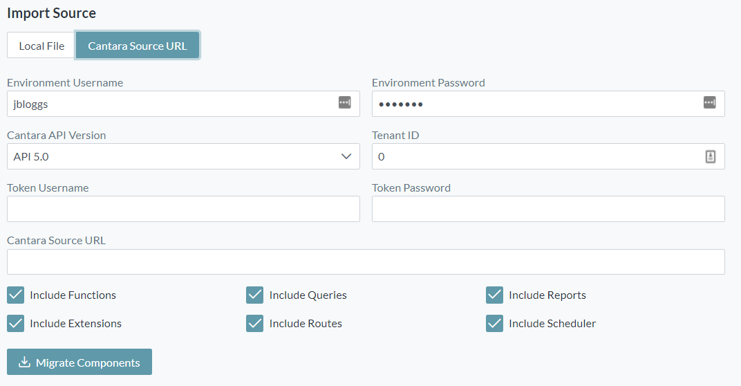 - Enter the Cantara API Version, Tenant ID, Token Username/Password and Cantara Source URL for the server where the components are to be imported from