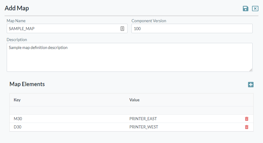 You can add as many elements as required in a single map. Each key must be unique and blanks are not allowed. - You can remove an element by clicking the Delete button on the appropriate row.