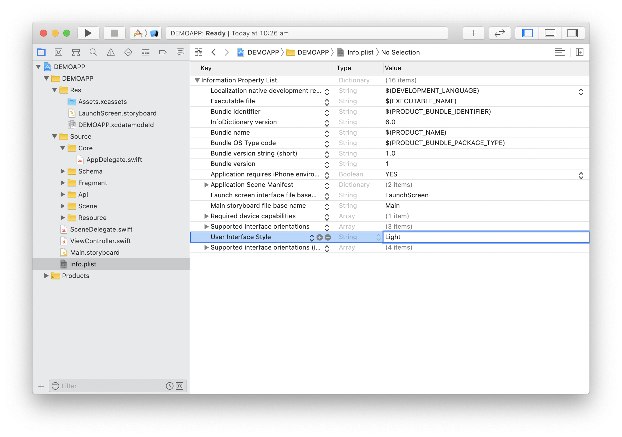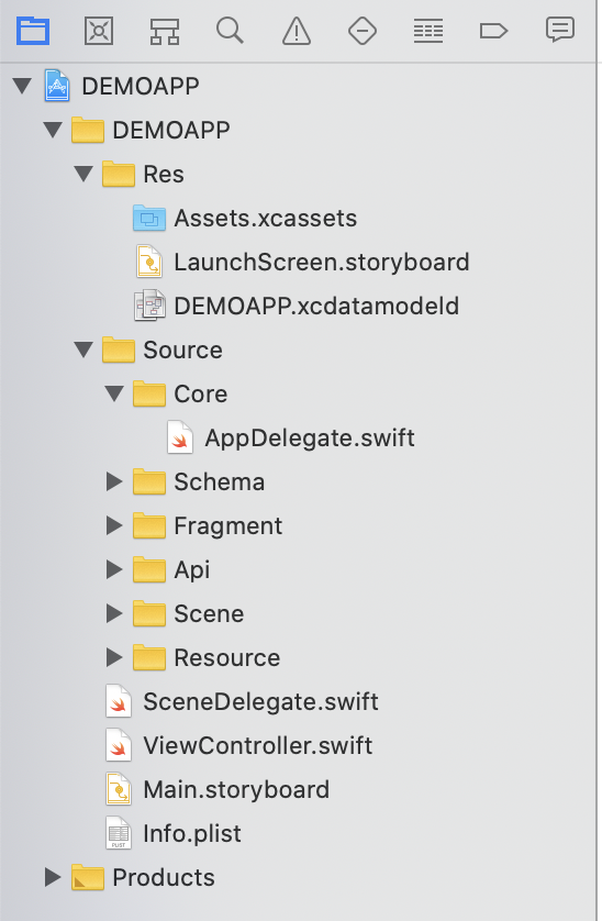 - Move the AppDelegate file to the Core folder, and the Assets, LaunchScreen and the Core Data file to the Res folder.