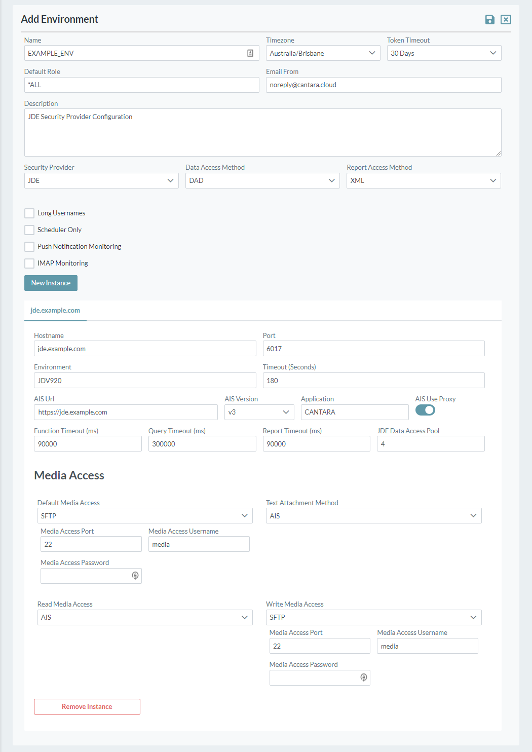 Click the New Instance button to connect additional JDE instances to the Cantara environment, if required.