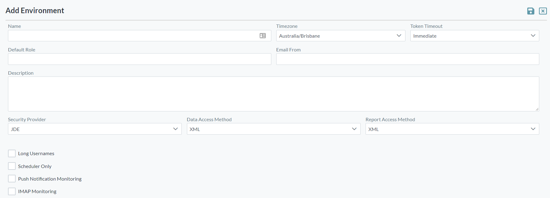 - Enter a Name for your new Cantara environment, and the access details for your JDE instance.