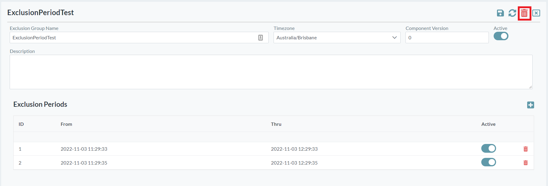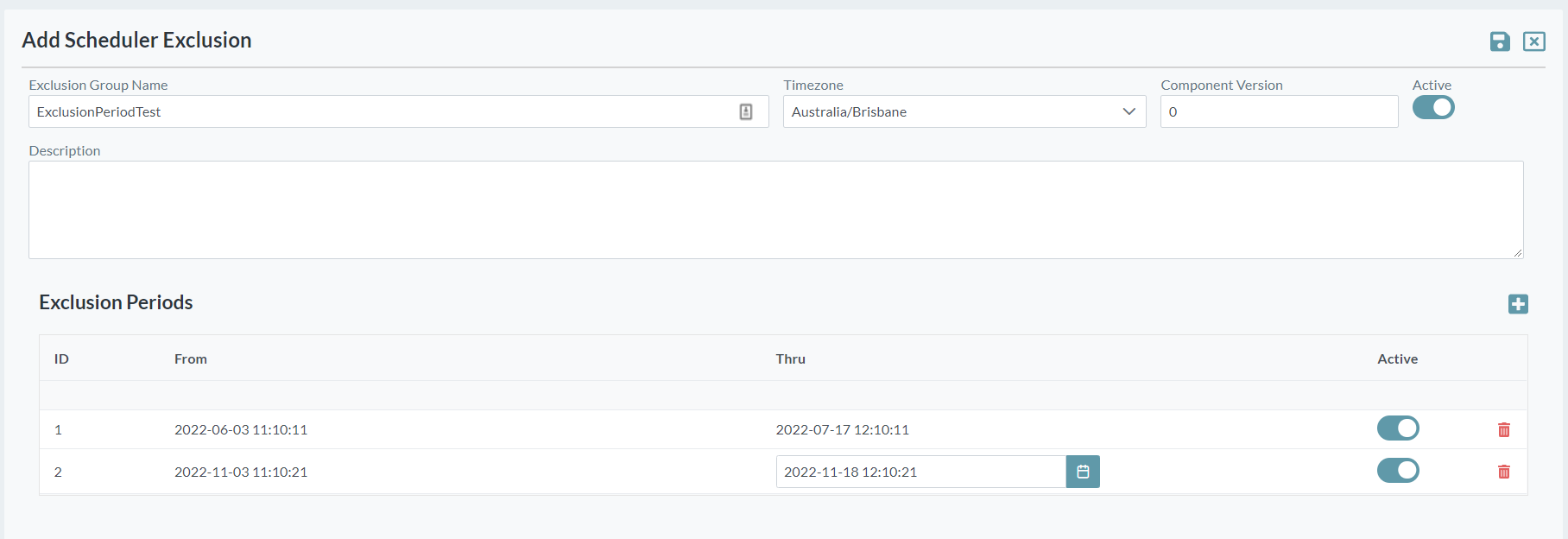 - Select the Active option so that the exclusion periods are applied. You can deactivate an exclusion set if required.