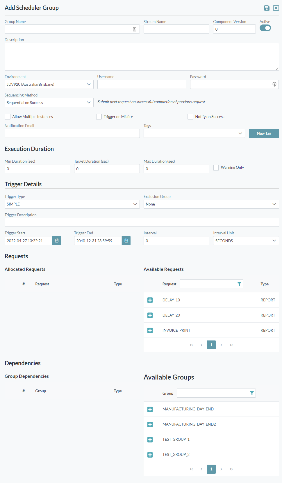 - Available Groups - If a group depends on another group running before it starts, click the plus sign next to the group to move the job to the Group Dependencies list. The order of the dependencies does not have an influence on the job. The system checks the trigger setting first, then any dependencies. When a trigger start setting occurs before the start date and time for a dependency, the system will wait for the dependency before it runs. If an error occurs for a dependency and it is unable to run, the job will have an error.