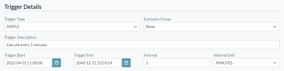 - The Trigger Start can be in the past. If you enter a date/time in the past, the next execution will be calculated based on the interval set to give the next execution after the current time.