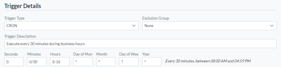 - In the spaces provided, enter the cron expression for the Seconds, Minutes, Hours, Day of Week, Day of Month, Month, and Year.