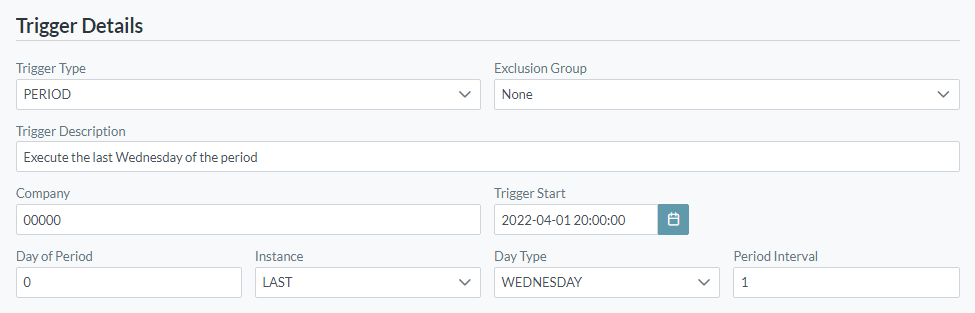 - If scheduling period triggers that run over multiple periods (i.e. every 3 periods), you must backdate your start date for the system to calculate the desired start date. The system calculates the next trigger date/time as follows: