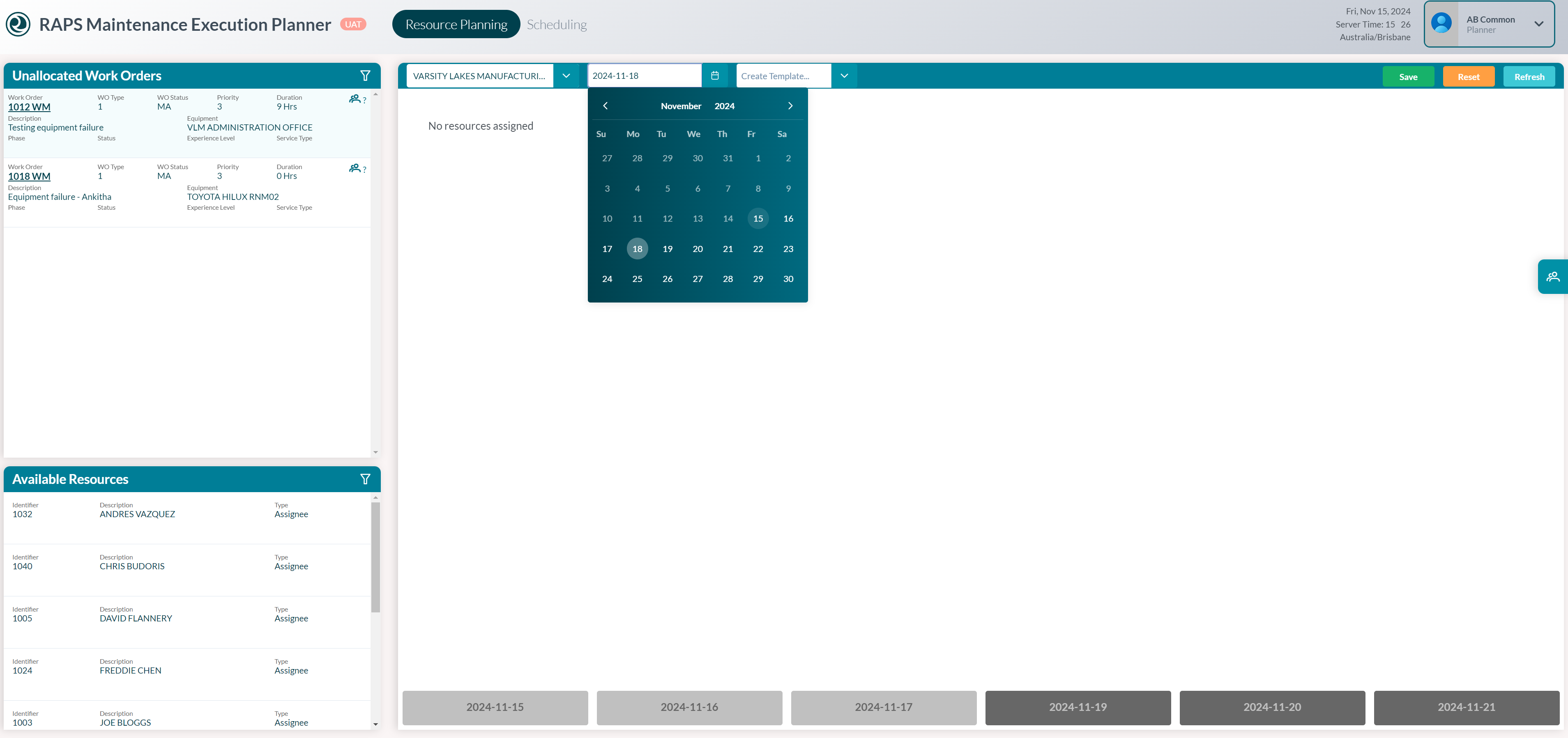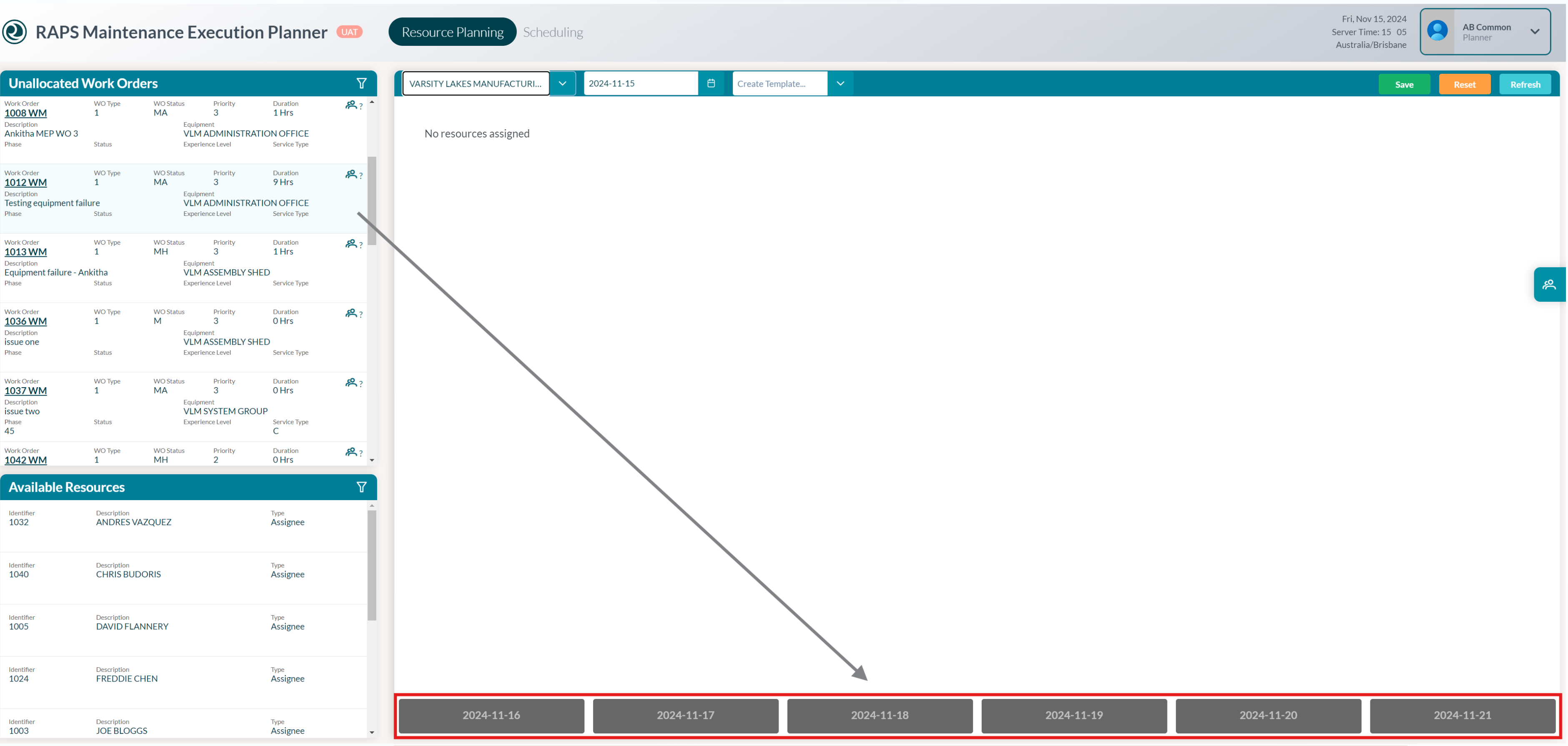 - Work Orders that are already assigned automatically appear on the planning board on your chosen date.