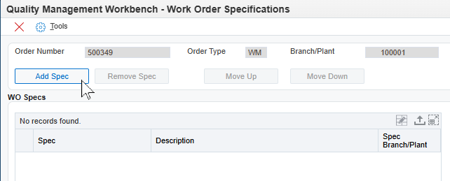 Clicking the Remove Spec button removes the currently selected Spec from the Work Order.