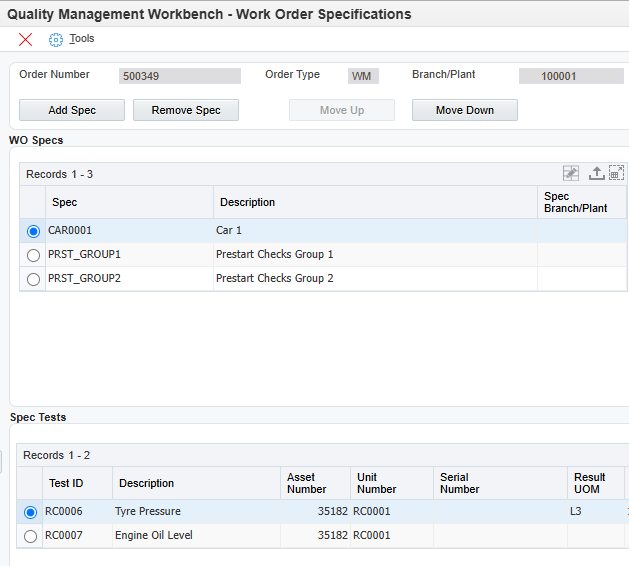 If attached successfully you’ll no longer see the “Attach Standard Spec” Row-exit button, and the "Results Speed Entry" Row-exit button will appear. If you have added multiple specifications, you can cycle through the tests shown by clicking the radio buttons in the WO Specs section. The currently selected Specification grid row in the upper grid can be moved up or down using the Move Up / Move Down buttons, which are enabled if the action is applicable for the selected grid row. The sequence of the Spec records in the upper grid determines the sequence that the data is displayed in for the Speed Enter Results and Review Results forms, and can determine the sequence that they are displayed in for integrated applications such as work order checklists.