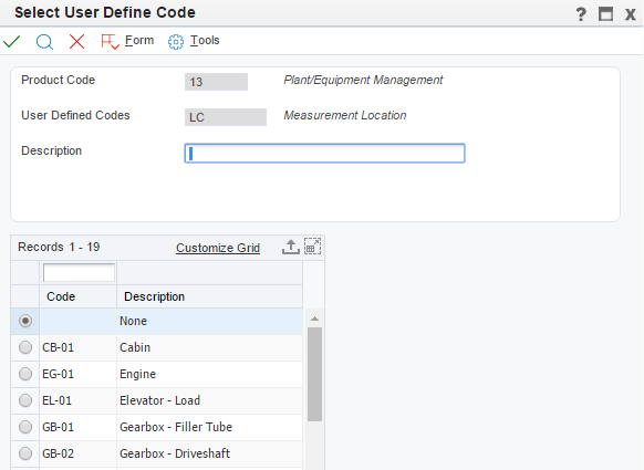 Measurement Locations are defined in UDC 13/LC. Blank can be configured as a valid value if only a generic measurement location is applicable.
