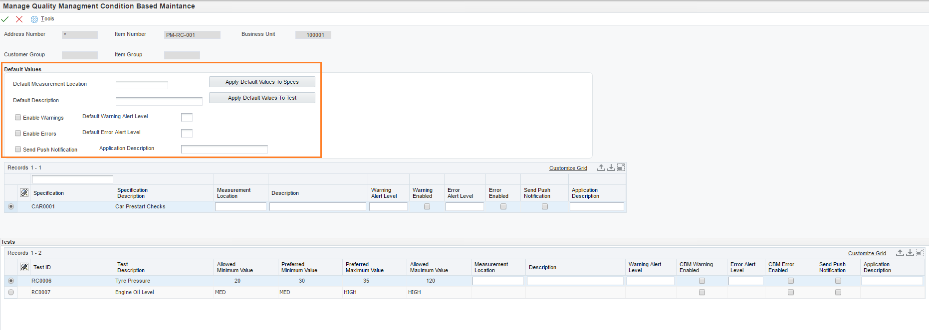 The CBM setup screen has an upper “Default Values” section that can be used to push a set of values out to both Specs and to Tests if only a generic set is required. Otherwise, you can enter directly into each line as required.