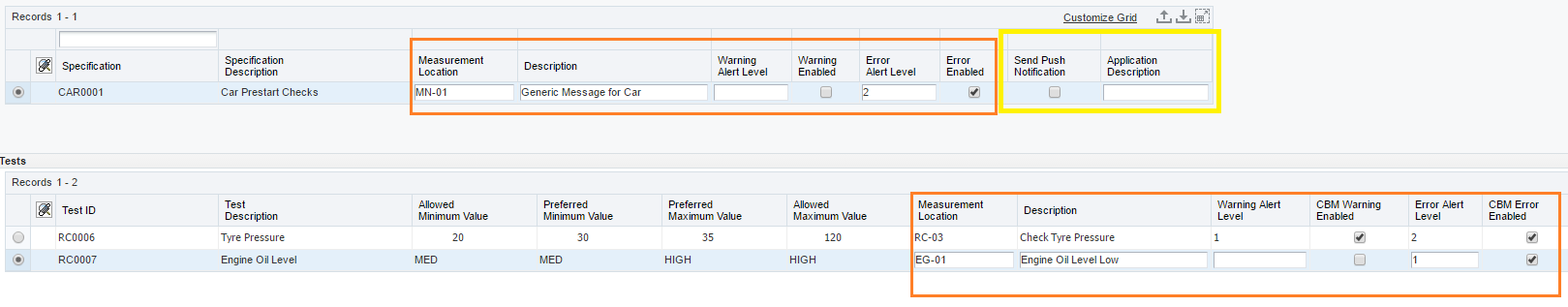 In this example the Engine Oil Level test has Error Alert Level set to “1’ this means that if the test Fails then this will just trigger a warning message rather than an Alarm message. However, we might have other engine tests where a particular result indicates an imminent failure where a failed test result should trigger an Alarm state (which could then trigger a subsequent Work Order as well as notification emails etc.)