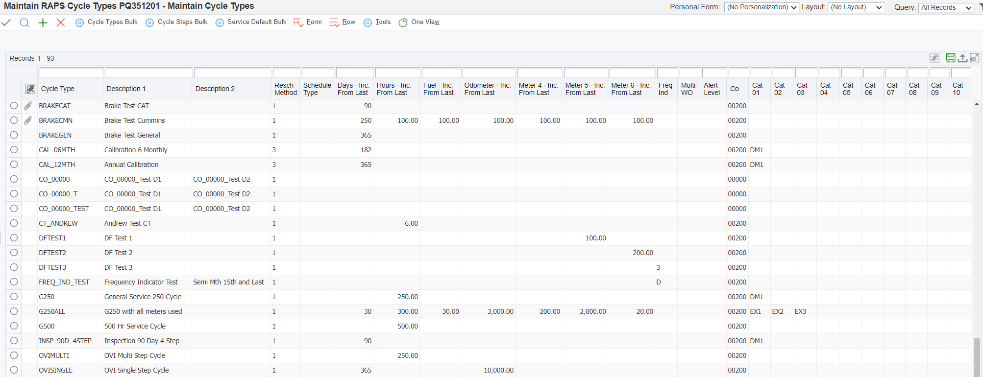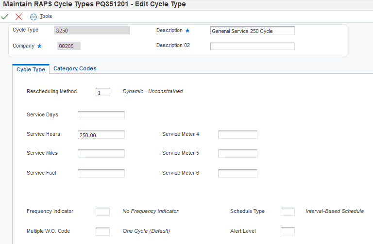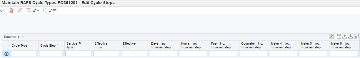- Frequency Indicator - As per the standard Frequency Indicator in JD Edwards PM Schedules. If the Frequency Indicator value is non-blank, then only one Cycle Step is permitted.