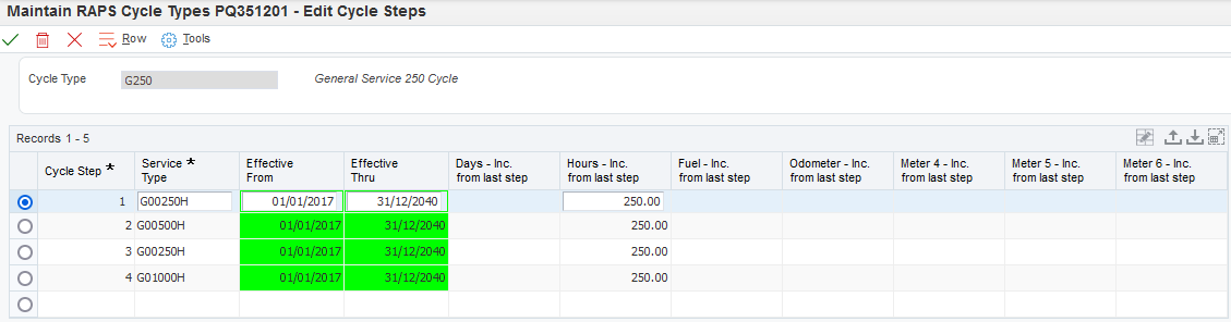 To Add Cycle Steps, highlight the Cycle Type in the Maintain Cycle Types inquiry form, then select the Cycle Steps Row Exit to access the Edit Cycle Steps form. The grid in this form requires Cycle Step and Service Type values. as a minimum. If not overridden, the effectivity dates will populate from the system date through to the configured JDE system end date, and step increments will default from the Cycle Type definitions. The meter increment values are the increment from the previous step or, in the case of the first step, the increment from the last step. Only meter increments that were defined for the Cycle Type are editable.