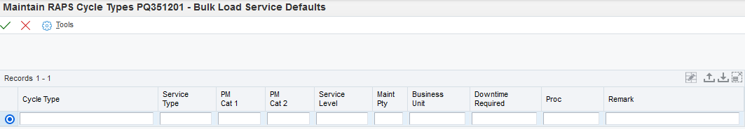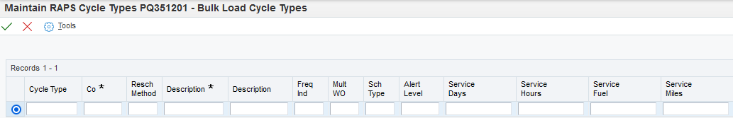 Cycle Types, Cycle Steps and Service Defaults can be prepared in advance in spreadsheets and bulk loaded via special forms which can be accessed via Form Exits from the Maintain Cycle Types Inquiry form. Details for more than one Asset can be loaded on these forms and validation will be performed as per the forms which maintain these details for an Asset.