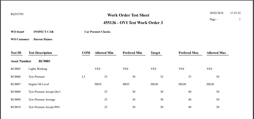 The Print Work Order Tests report prints the tests to be completed, with Allowed, Preferred and Target values for each test.