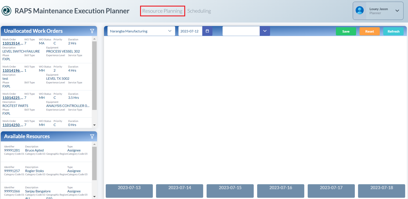 Maintenance Execution Planner provides a graphical display of work orders and resources available for work order assignment. Both Unallocated Work Orders and Available Resources are filterable.